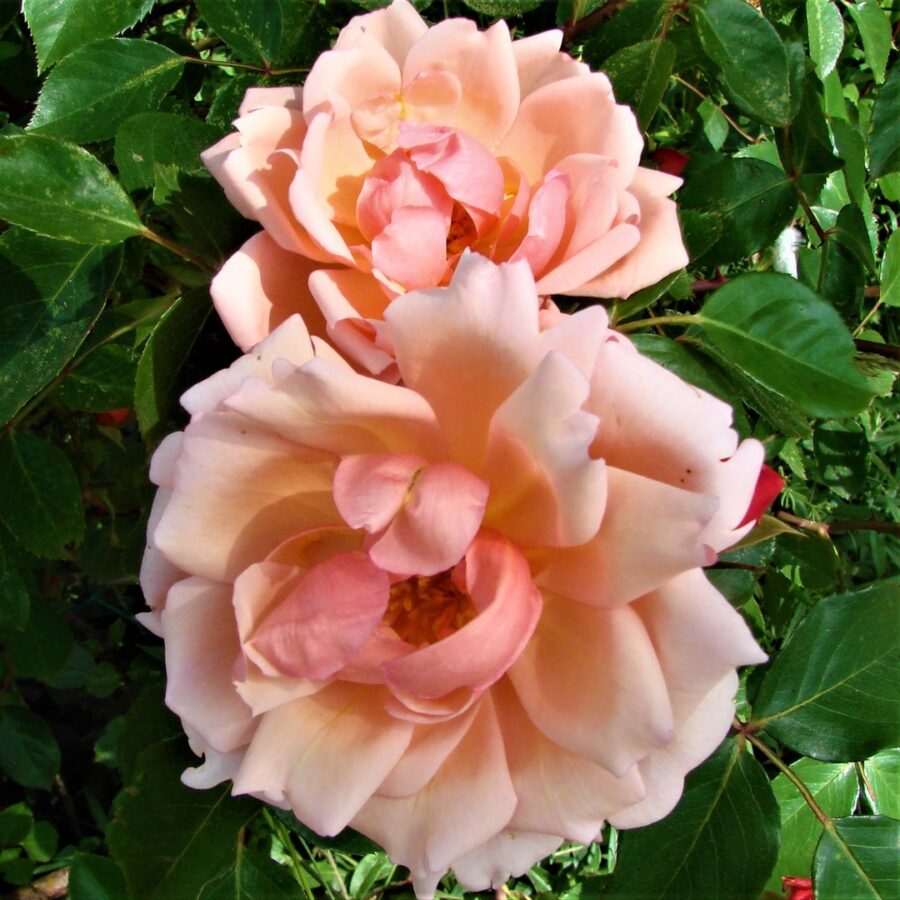 Hoa Albertine có màu hồng pha cam tươi sáng, tạo cảm giác ấm áp và lãng mạn. Bông tròn, nhiều lớp cánh xếp chồng kiểu cổ điển, đường kính 8–10 cm, luôn tỏa sáng trên giàn leo hoặc bụi trung tâm, mang đến vẻ đẹp đầy sức sống.